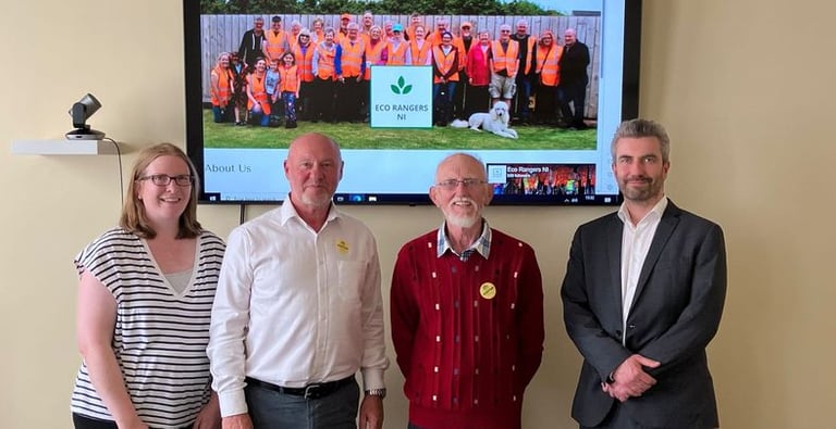 Today our Chairperson Stephen Marshall and Honorary President Abe Agnew met local councillors and MLAs from the Alliance party at Parliament Buildings, Stormont. During the meeting we discussed the impact of litter on local communities, the environment and the economy; what Eco Rangers NI volunteers are doing to reduce this, and how elected representatives can help. We were delighted that all the representatives were fully in support of our work and eager to get involved with our plans to effect real change to reduce road litter across Northern Ireland.